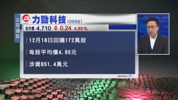 【Now財經台】力勁科技(00558)周一回購172萬股,佔當天成交量25.2%,亦是公司上市以來首次回購股份。