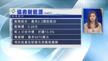 公司計劃配售最多約2.3億股股份,佔已發行股本20%,配售價每股0.26元,較上日收市價0.3元折讓13%,集資最多5970萬元,將用於投資及研發天然氣、液化天然氣及綜合能源項目管理業務有關的成本,其餘則用作一般營運資金。