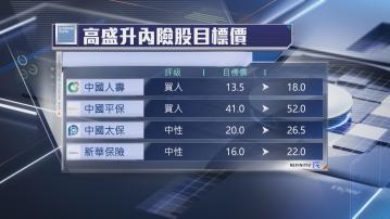【Now財經台】繼摩根大通後,高盛全面上調內險股目標價,其中,以早前發盈喜的新華保險(01336)上調幅度最大,高達38%,最新看22元,中國人壽(02628)及中國太保(02601)上調33%至18元及26.5元,中國平安(02318)上調27%至52元,中國太平(00966)調高35%至10.5元,中國人民保險集團(01339)及中國財險(02328)上調15%及17%,是上調幅度最小的兩隻股份,所有股價評級維持不變。