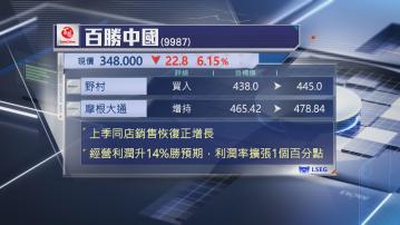 野村表示,百勝中國上季毛利勝預期,經營利潤增長14%,較市場預期高5%,主要受惠於成本控制,期內,同店銷售恢復正增長,微升1%,重申「買入」評級。