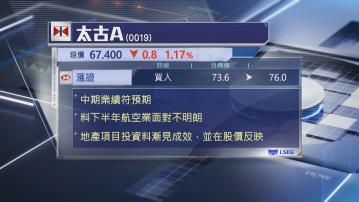 該行指出,太古中期業績符預期,其中,航空業增長最勁,地產及飲品業則錄得溫和跌幅。滙證又稱,太古A派息連續5年加碼,但未有公布股份回購計劃令市場失望。