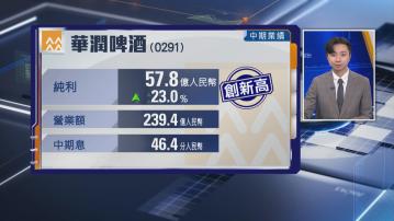 潤啤上半年賺逾57.8億元人民幣,創新高,營業額按年增長不足1%至逾239億元人民幣,派中期息0.464元人民幣,較去年同期增逾24%。