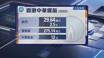 【Now財經台】香港中華煤氣(00003)中期少賺2.5%至29.6億元,營業額按年微升至逾275億元,派中期息12仙,按年持平。