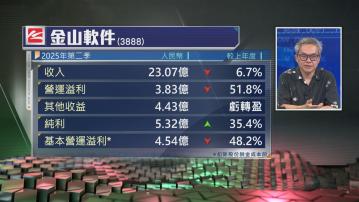 【Now財經台】金山軟件(03888)第二季收入跌6.7%,扣除股份酬金成本前營運溢利跌48.2%。