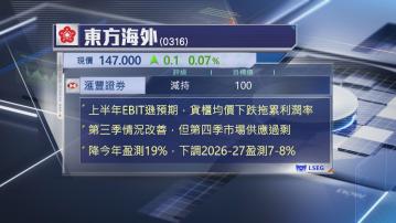 該行指,東方海外上半年息稅前盈利(EBIT)遜預期,主要受累期內貨櫃均價下跌,拖累利潤率大跌10個百分點,雖然第3季情況有改善,但第4季航運市場或再出現供應過剩情況,經營將面臨較大挑戰,下調今年盈測19%,2026至27年則下調7%至8%。