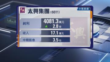 【Now財經台】太興集團(06811)中期純利4081萬元,按年大升2.8倍,主要受惠於嚴格控制成本,以及分店整合策略見效,期內,收入按年增長6%至17.1億元,中期息大增40%至3.5仙。