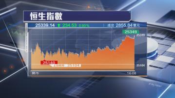 大市今日(22日)高開100點後,早段升幅一度收窄至35點,尾市升幅擴大,最多升244點,收市報25339點,升234點。大市全日成交增至逾2855億元。