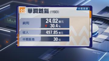 【Now財經台】華潤燃氣(01193)上半年純利按年跌逾30%至24億元,收入按年跌逾4%至逾497億元,派中期息30仙。