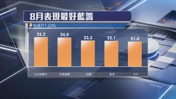 8月表現最佳藍籌,依次為比亞迪電子(00285)升25.2%、京東健康(06618)升24.9%、中國宏橋(01378)升22.3%、紫金礦業(02899)升22.1%、中升控股(00881)升21.4%。