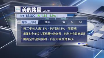 美的集團上半年純利增25%,賺260億元人民幣,大摩指單計第2季收入升11%,純利增15%,都高過預期,集團調高全年指引,料全年收入可以實現雙位數增長,原先預期是高單位數,去到10%至13%增長,亦都預期全年純利有較高增長。