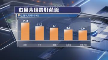 本周表現最佳藍籌,依次為百度集團(09888)升14.2%、中芯國際(00981)升11.2%、美團(03690)升10.1%、理想汽車(02015)升8.6%、比亞迪股份(01211)升7.9%。