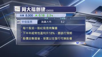 【Now財經台】周大福創建(00659)宣布每10股派1股紅股,中信里昂指有驚喜。