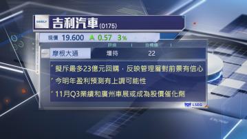 摩通認為,吉利回購反映管理層對盈利及股價前景有信心,又認為估值被低估。