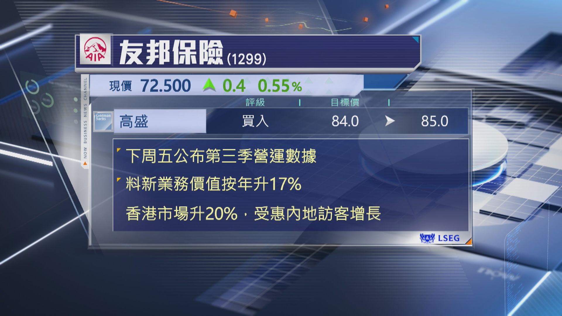 【Now財經台】高盛輕微上調友邦保險(01229)目標價,由84元調高至85元。
